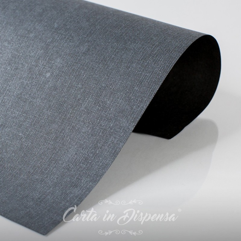 È un tipo di carta goffrata sul fronte con una texture che richiama la trama del Jeans. Retro nero goffrato, carta leggera che si presta benissimo alla cordonatura e non si segna al contatto. Molto versatile e adatta al taglio con fustelle, ideale per la creazione di buste e dettagli decorativi.