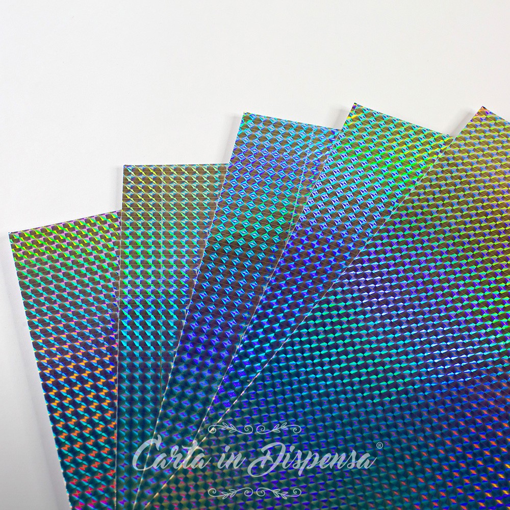 Realizzata con un film metallizzato argento traslucente, questa carta offre un aspetto brillante dai riflessi olografici arcobaleno.