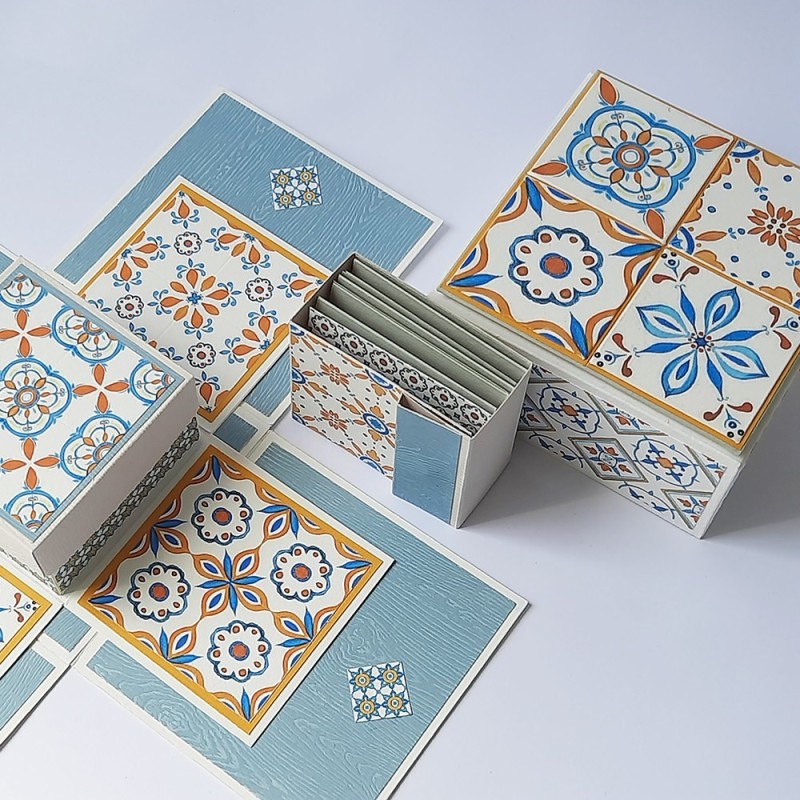 Nel kit ci sono carte sufficienti per realizzare il progetto di un cofanetto rigido in tre misure : 14x14x8 cm ; 12,5x25x4,5 cm ; 20x20x2,5 cm